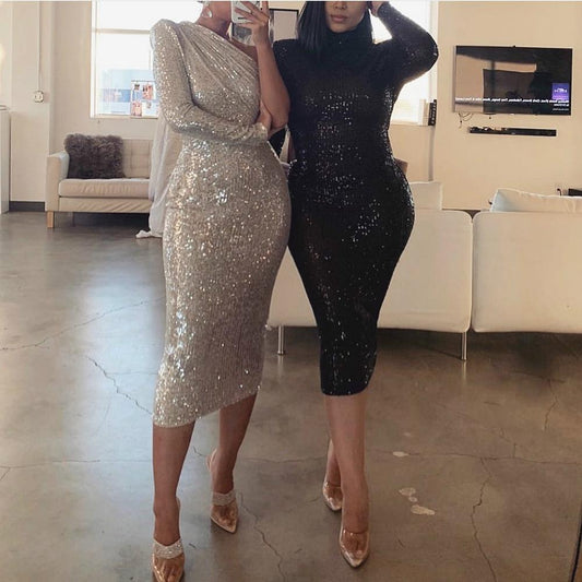 AB05SC 2023 Cross-border Foreign Trade Europe And The United States Single Shoulder Dress Oblique Collar Wrap Chest Evening Dress Fashion Sequins Nightclub Sexy Women's Clothing